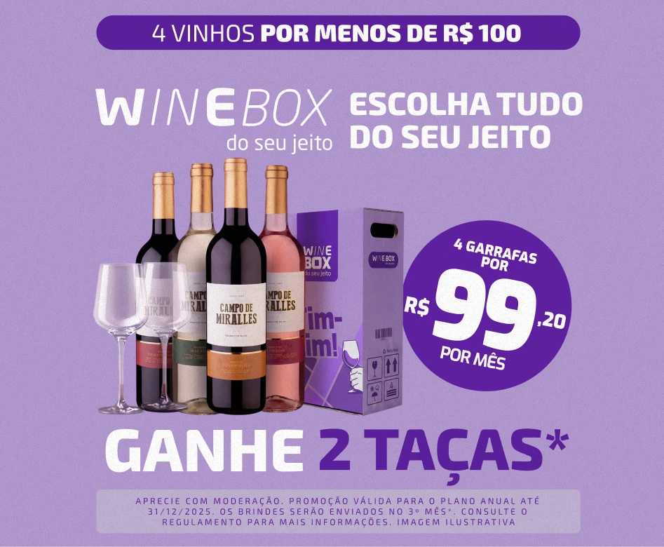 A WineBox do Seu Jeito é uma assinatura mensal do Clube Wine, o maior clube de vinhos no mundo com mais de 380 mil sócios. Os vinhos são escolhidos por nossa Sommelière, especialista no assunto, que considera os estilos que você escolheu para compor sua caixa. A Wine Box do Seu Jeito oferece 4 estilos diferentes: você escolhe 2 estilos e recebe 4 garrafas, 2 garrafas de cada estilo escolhido.