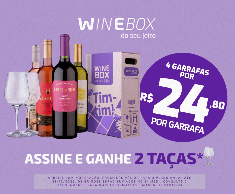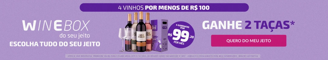 A WineBox do Seu Jeito é uma assinatura mensal do Clube Wine, o maior clube de vinhos no mundo com mais de 380 mil sócios. Os vinhos são escolhidos por nossa Sommelière, especialista no assunto, que considera os estilos que você escolheu para compor sua caixa. A Wine Box do Seu Jeito oferece 4 estilos diferentes: você escolhe 2 estilos e recebe 4 garrafas, 2 garrafas de cada estilo escolhido.